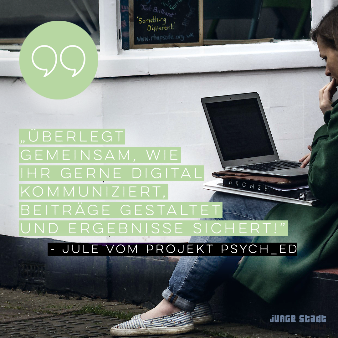 Jule: „Mein Tipp ist: Organisiert euch! Überlegt gemeinsam, wie ihr gerne digital kommuniziert, Beiträge gestaltet und Ergebnisse sichert. Wenn das festgehalten wird, klappen digitale Meetings und Ergebnissicherung schon viel besser.“