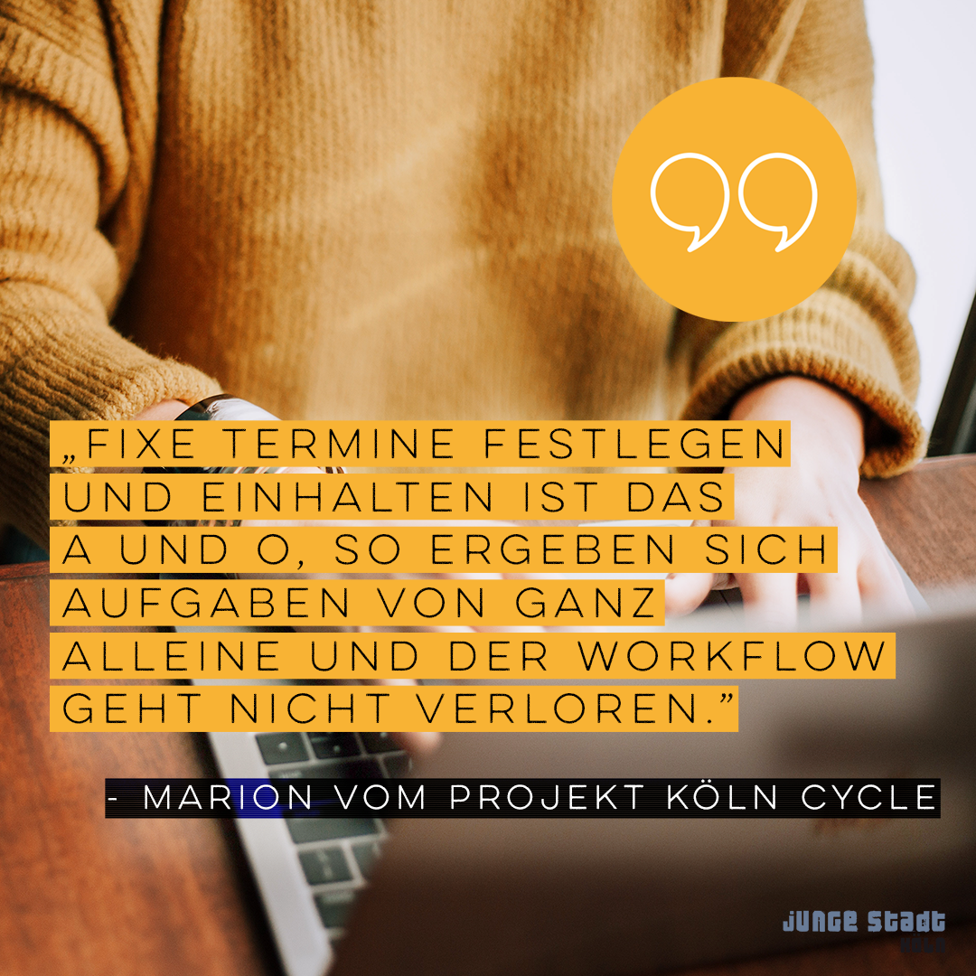 Zoom-Meeting statt Stammtisch und Instagram-Account statt Upcycling: Um Social Distancing zu gewährleisten und unsere Aktiven und ihre Mitmenschen zu schützen, treffen wir uns im Moment nicht persönlich. Unserem Engagement setzt das aber kein Ende: Stattdessen nutzen wir die Zeit zum Planen, Organisieren und Austauschen. Im Interview erzählen Jule vom Projekt Psych_Ed und Marion vom Projekt Köln_Cycle von ihren Tipps für digitale Projektarbeit.