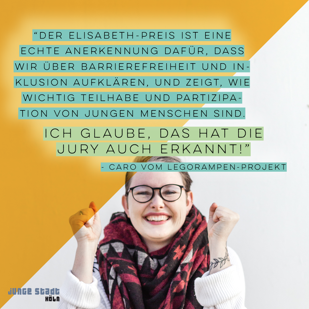 Das Zitat des Monats verrät es schon: Wir haben etwas zu feiern! Im November ging der Elisabeth-Preis der CaritasStiftung im Erzbistum Köln an junge Stadt Köln - genau genommen an das Legorampen-Projekt. Wir haben uns riesig gefreut! Projektinitiatorin Caro durfte im Livestream der Preisverleihung dabei sein und hat uns erzählt, was ihr dabei durch den Kopf gegangen ist. Außerdem im Newsletter: das neue Logo von KölnCycle und Interviews mit Toni und Marlon von Psych_Ed.